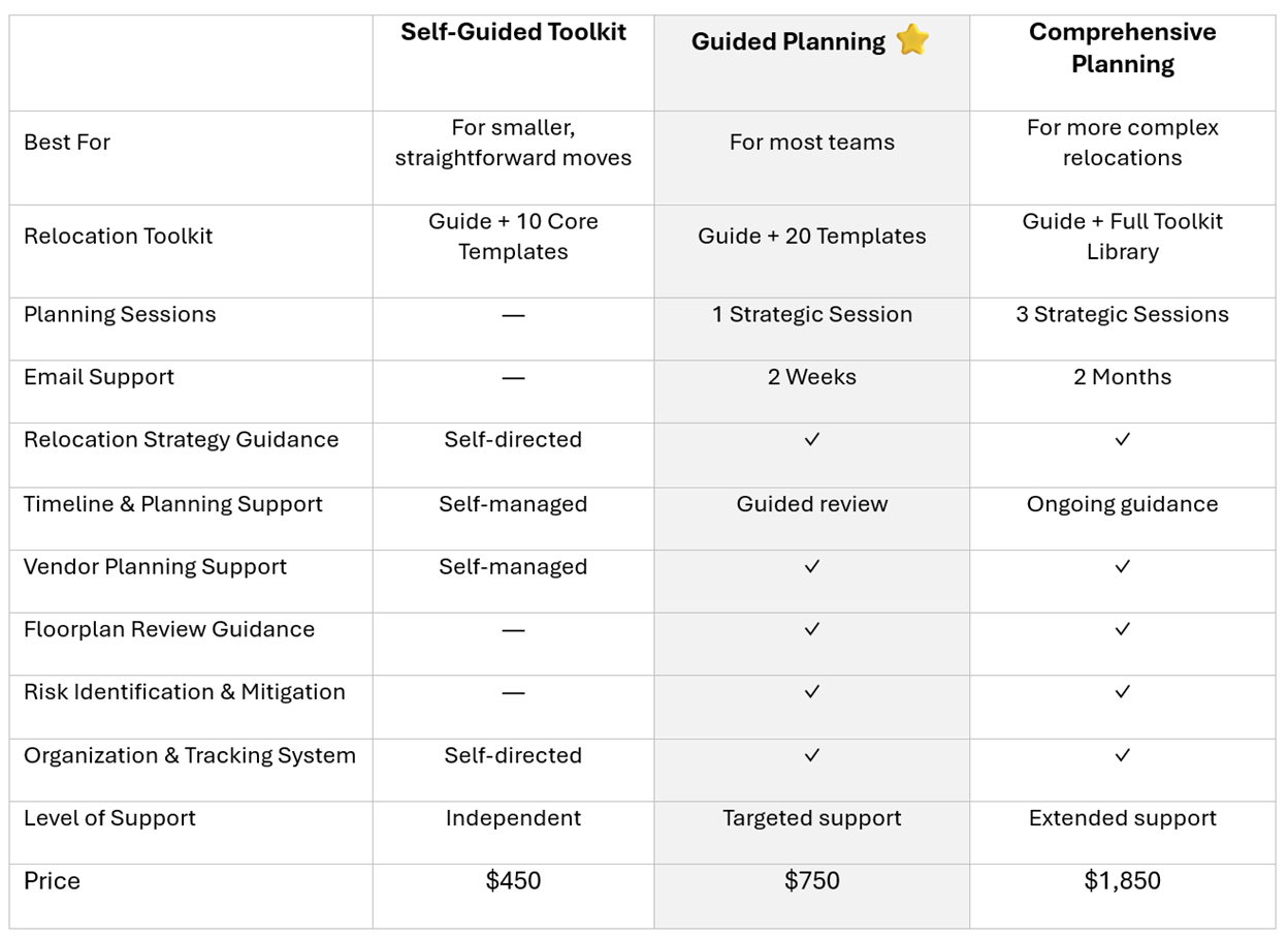 Whether you’re months away from your office relocation or already under pressure, we’re here to help you organize the details with a clear plan, proven tools and expert guidance to avoid costly mistakes and move forward with confidence.
